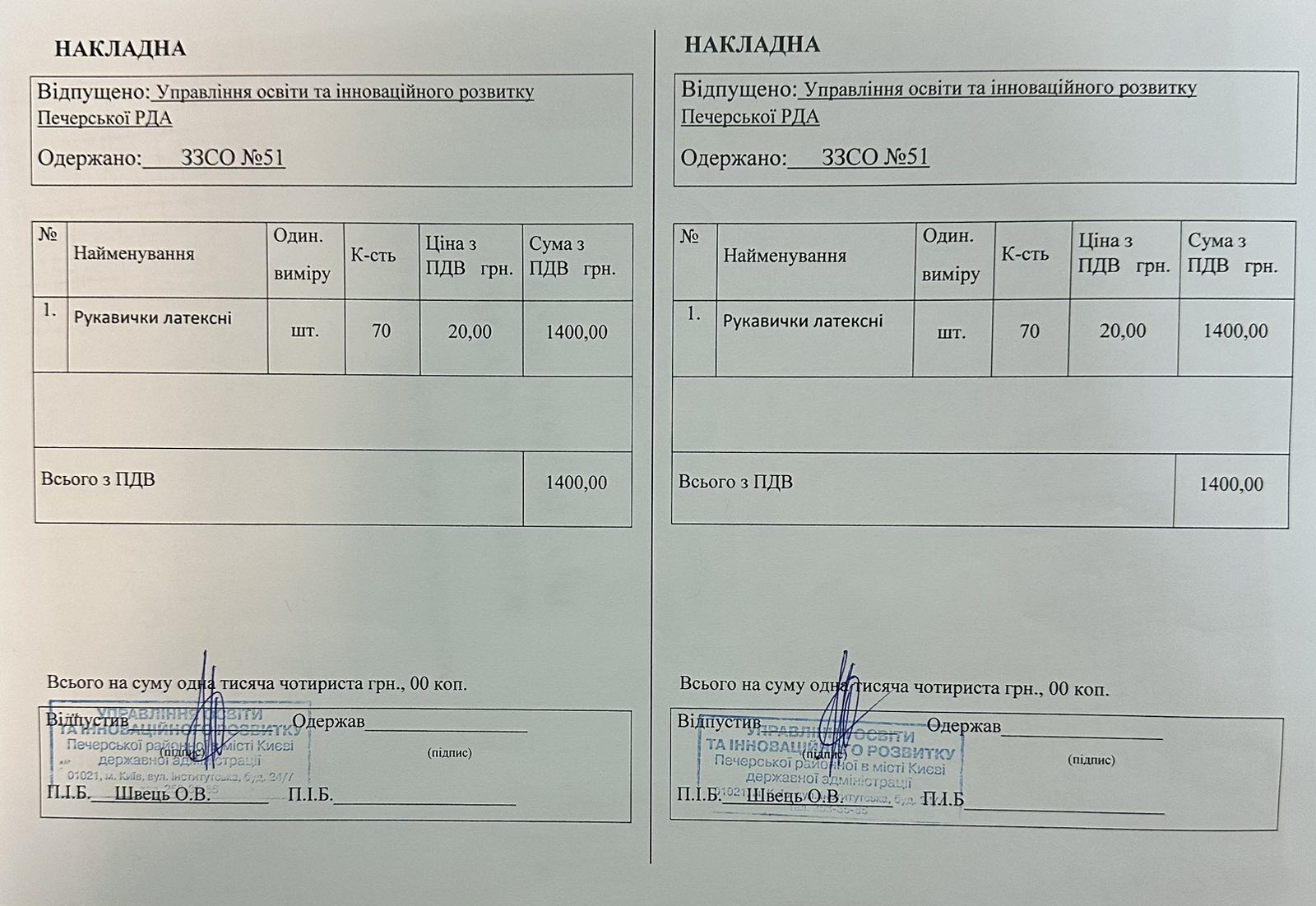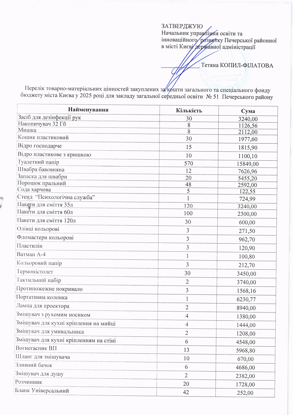 Інформація про отримані у 2019 році матеріальні цінності на побутові потреби (дріб’язок) за кошти місцевого бюджету для закладу загальної середньої освіти № 51 Печерського району м. Києва