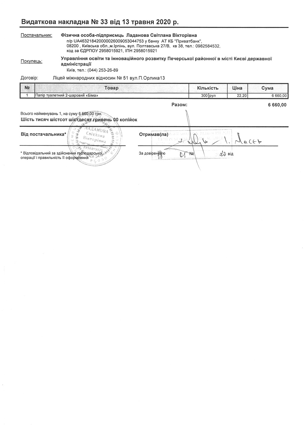 Інформація про отримані у 2019 році матеріальні цінності на побутові потреби (дріб’язок) за кошти місцевого бюджету для закладу загальної середньої освіти № 51 Печерського району м. Києва