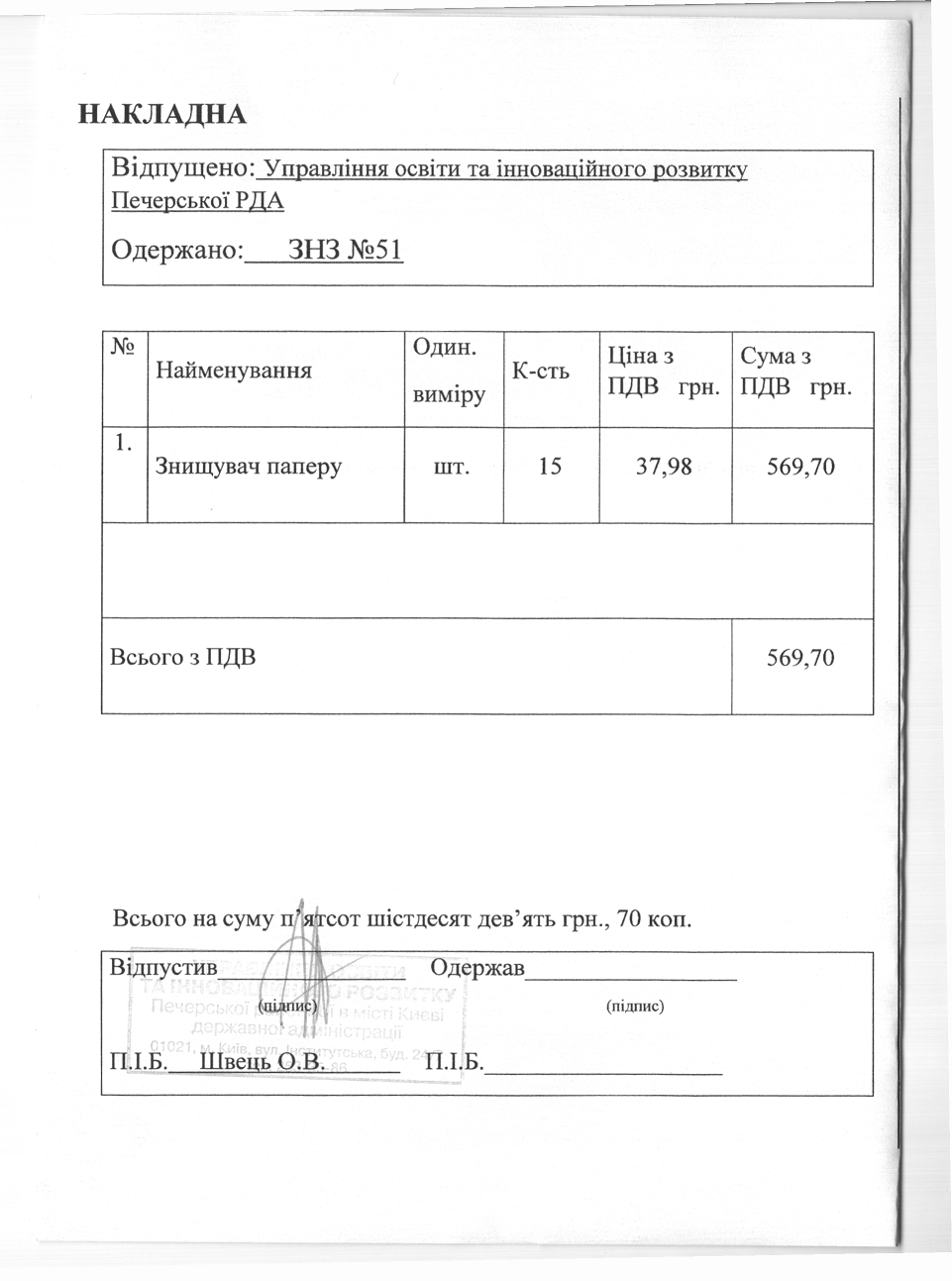 Інформація про отримані у 2019 році матеріальні цінності на побутові потреби (дріб’язок) за кошти місцевого бюджету для закладу загальної середньої освіти № 51 Печерського району м. Києва