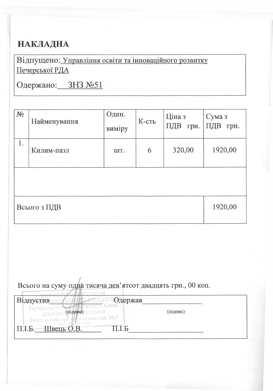 Інформація про отримані у 2019 році матеріальні цінності на побутові потреби (дріб’язок) за кошти місцевого бюджету для закладу загальної середньої освіти № 51 Печерського району м. Києва