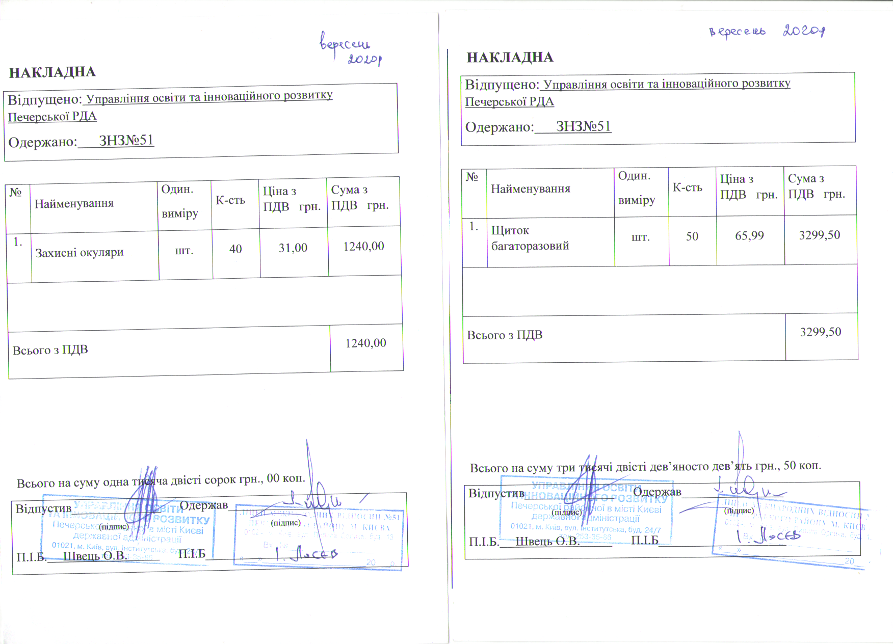 Інформація про отримані у 2019 році матеріальні цінності на побутові потреби (дріб’язок) за кошти місцевого бюджету для закладу загальної середньої освіти № 51 Печерського району м. Києва