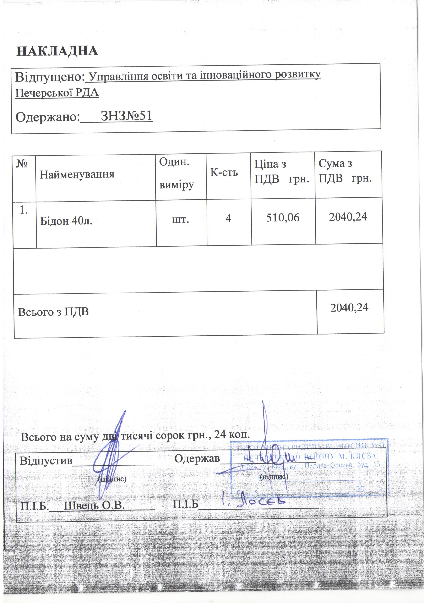 Інформація про отримані у 2019 році матеріальні цінності на побутові потреби (дріб’язок) за кошти місцевого бюджету для закладу загальної середньої освіти № 51 Печерського району м. Києва