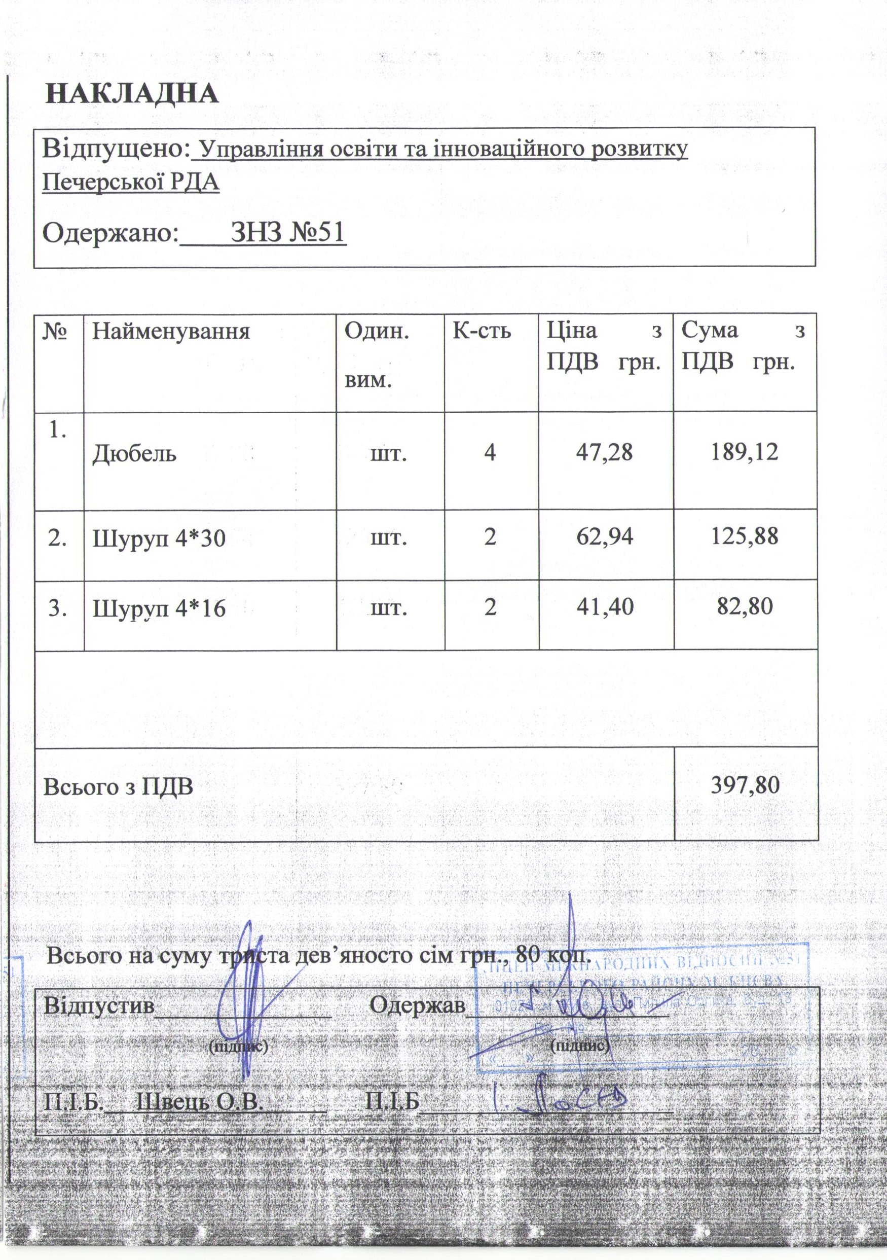 Інформація про отримані у 2019 році матеріальні цінності на побутові потреби (дріб’язок) за кошти місцевого бюджету для закладу загальної середньої освіти № 51 Печерського району м. Києва