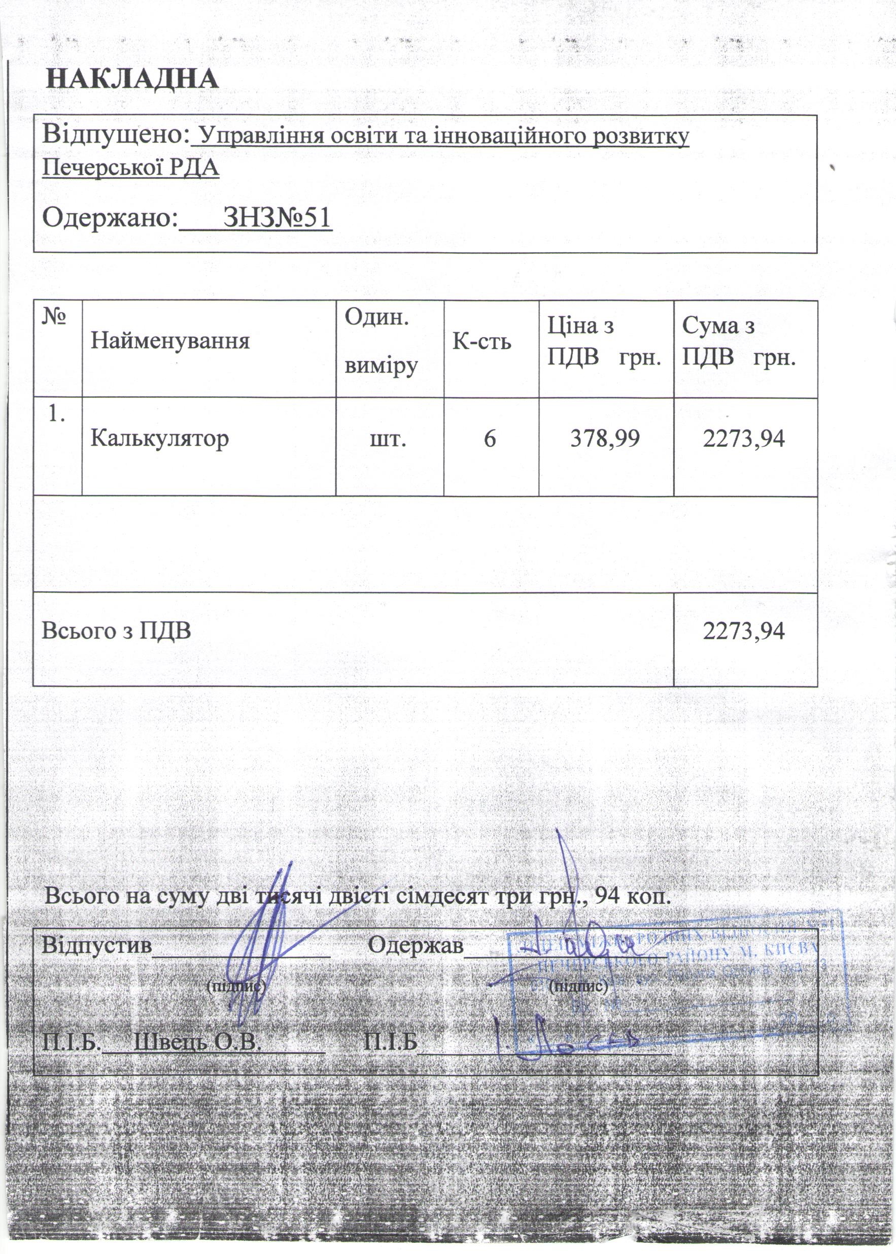 Інформація про отримані у 2019 році матеріальні цінності на побутові потреби (дріб’язок) за кошти місцевого бюджету для закладу загальної середньої освіти № 51 Печерського району м. Києва