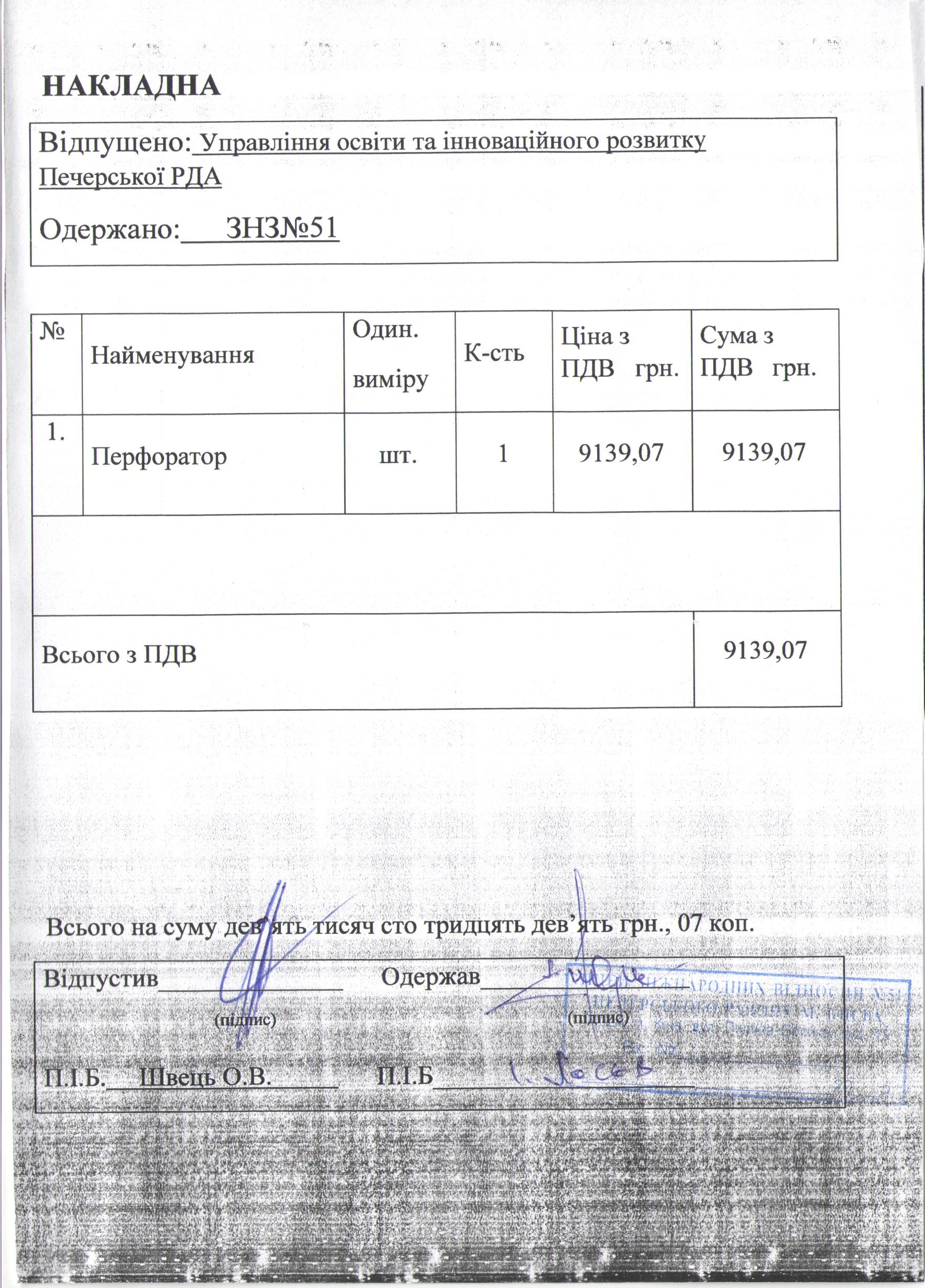 Інформація про отримані у 2019 році матеріальні цінності на побутові потреби (дріб’язок) за кошти місцевого бюджету для закладу загальної середньої освіти № 51 Печерського району м. Києва