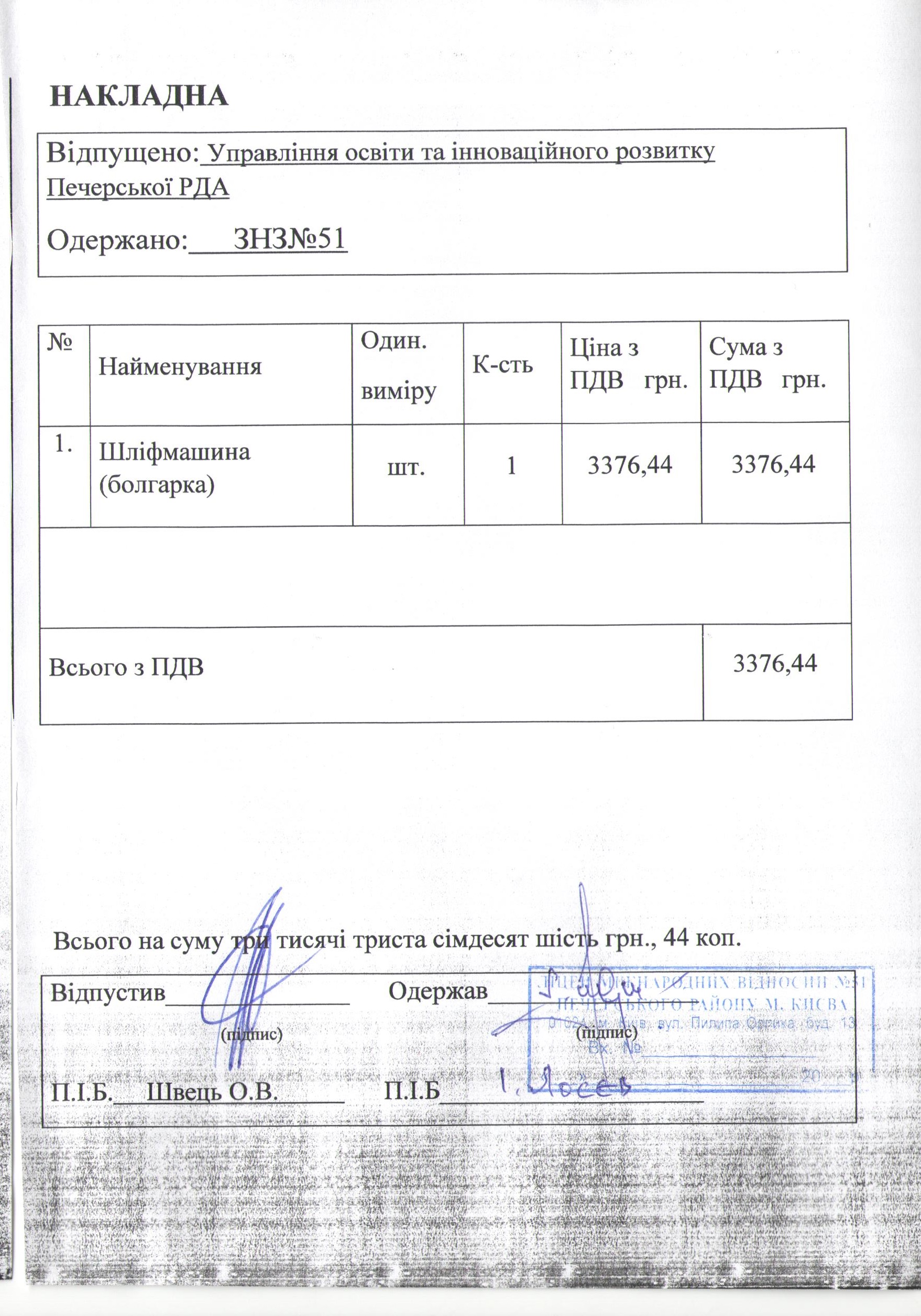 Інформація про отримані у 2019 році матеріальні цінності на побутові потреби (дріб’язок) за кошти місцевого бюджету для закладу загальної середньої освіти № 51 Печерського району м. Києва