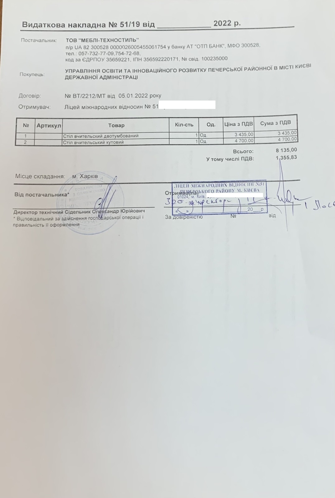 Інформація про отримані у 2019 році матеріальні цінності на побутові потреби (дріб’язок) за кошти місцевого бюджету для закладу загальної середньої освіти № 51 Печерського району м. Києва