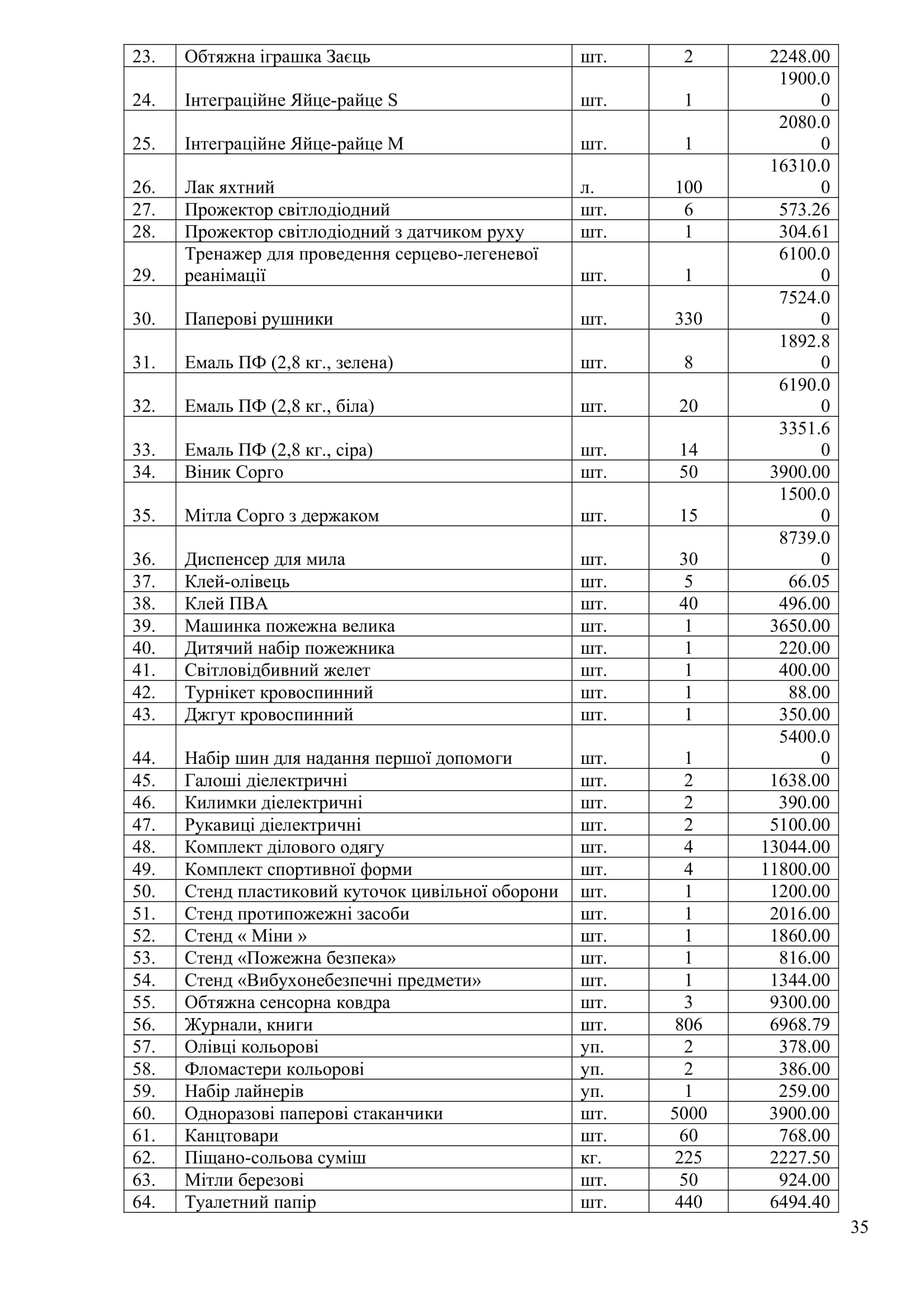 Перелік матеріально-технічних цінностей закуплених за кошти місцевого бюджету