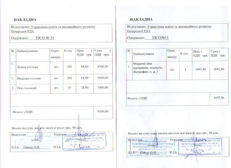 Інформація про отримані у 2019 році матеріальні цінності на побутові потреби (дріб’язок) за кошти місцевого бюджету для закладу загальної середньої освіти № 51 Печерського району м. Києва