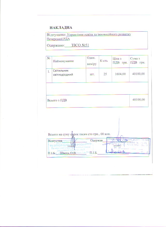 Інформація про отримані у 2019 році матеріальні цінності на побутові потреби (дріб’язок) за кошти місцевого бюджету для закладу загальної середньої освіти № 51 Печерського району м. Києва