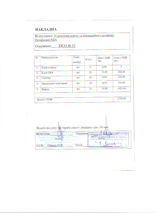Інформація про отримані у 2019 році матеріальні цінності на побутові потреби (дріб’язок) за кошти місцевого бюджету для закладу загальної середньої освіти № 51 Печерського району м. Києва