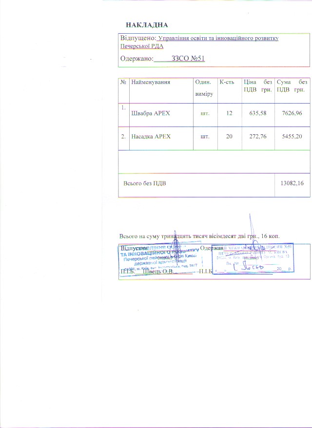 Інформація про отримані у 2019 році матеріальні цінності на побутові потреби (дріб’язок) за кошти місцевого бюджету для закладу загальної середньої освіти № 51 Печерського району м. Києва