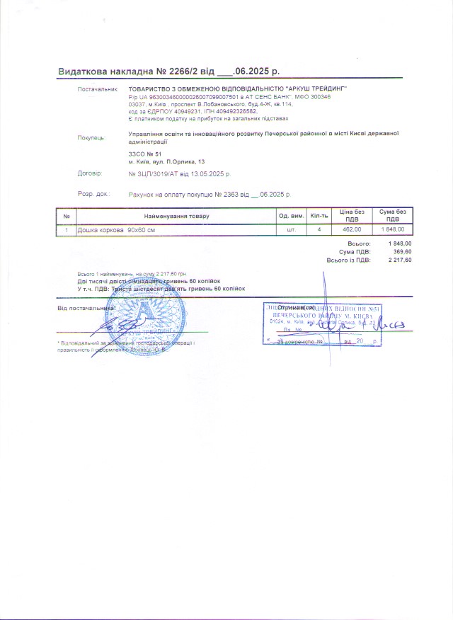 Інформація про отримані у 2019 році матеріальні цінності на побутові потреби (дріб’язок) за кошти місцевого бюджету для закладу загальної середньої освіти № 51 Печерського району м. Києва