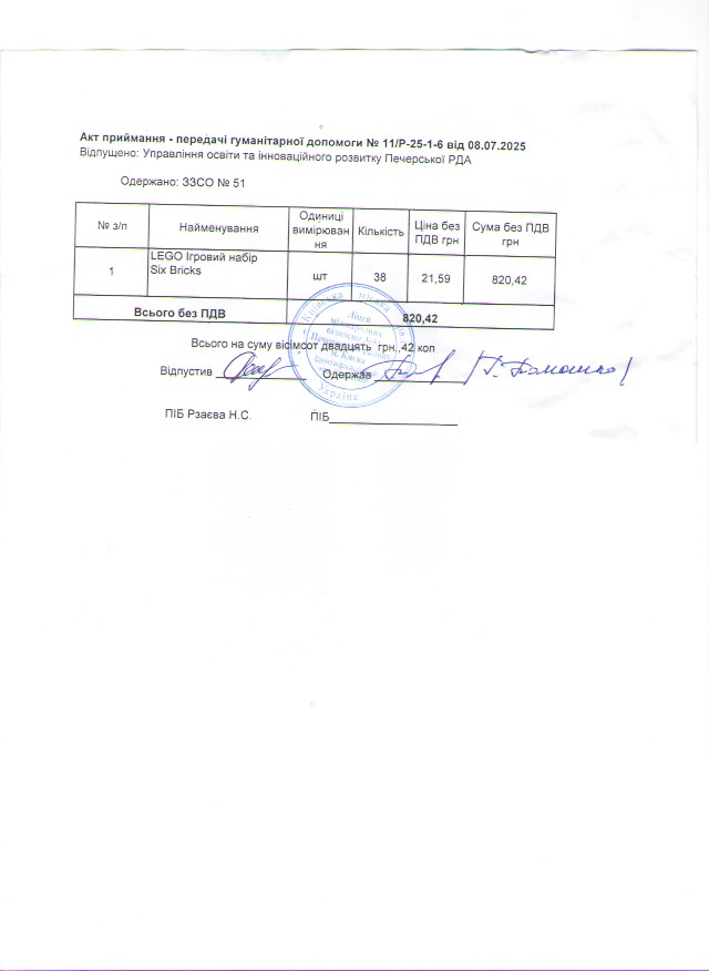 Інформація про отримані у 2019 році матеріальні цінності на побутові потреби (дріб’язок) за кошти місцевого бюджету для закладу загальної середньої освіти № 51 Печерського району м. Києва